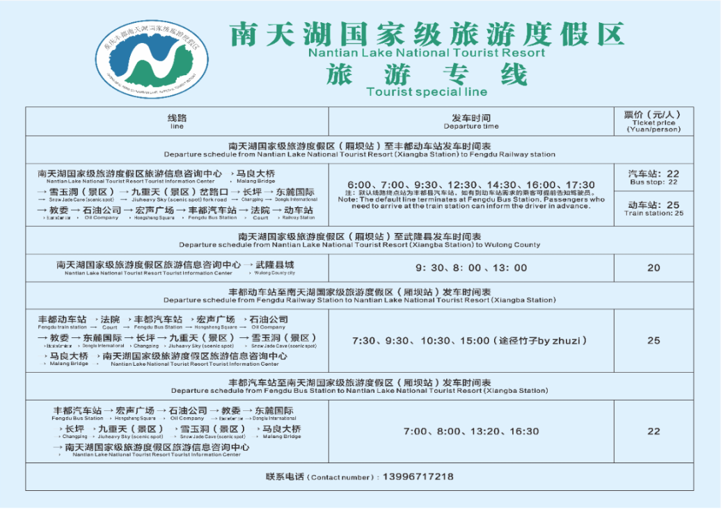 【溫馨提示:乘坐動車到豐都站下站后到南天湖景區專線車班次咨詢電話:13996717218】