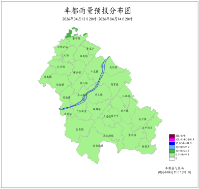 2026年4月10日16時至4月11日16時我縣陣雨。最大降雨量為53.0mm(栗子);最低氣溫8.0 (南天湖景區)~16.6℃,最高氣溫15.9~26.4℃(雙路涼水井)。暨龍、高家、雙路、名山、豐都、十直、龍河出現7級大風,極大風速15.8米/秒(龍河,10日17時)。豐都國家基本站雨量20.2mm,最低氣溫15.1℃,最高氣溫23.4℃。