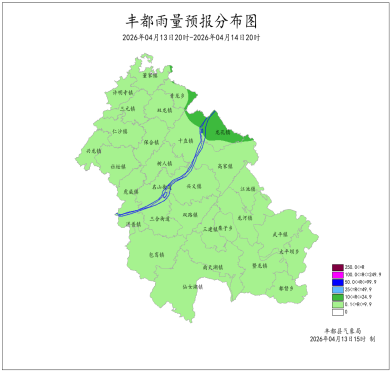 2026年4月12日16時至4月13日16時我縣小到中雨。最大降雨量為21.3mm(南天湖景區);最低氣溫10.2 (南天湖景區)~18.0℃,最高氣溫11.6~25.9℃(興龍)。豐都國家基本站雨量6.4mm,最低氣溫16.8℃,最高氣溫21.6℃。