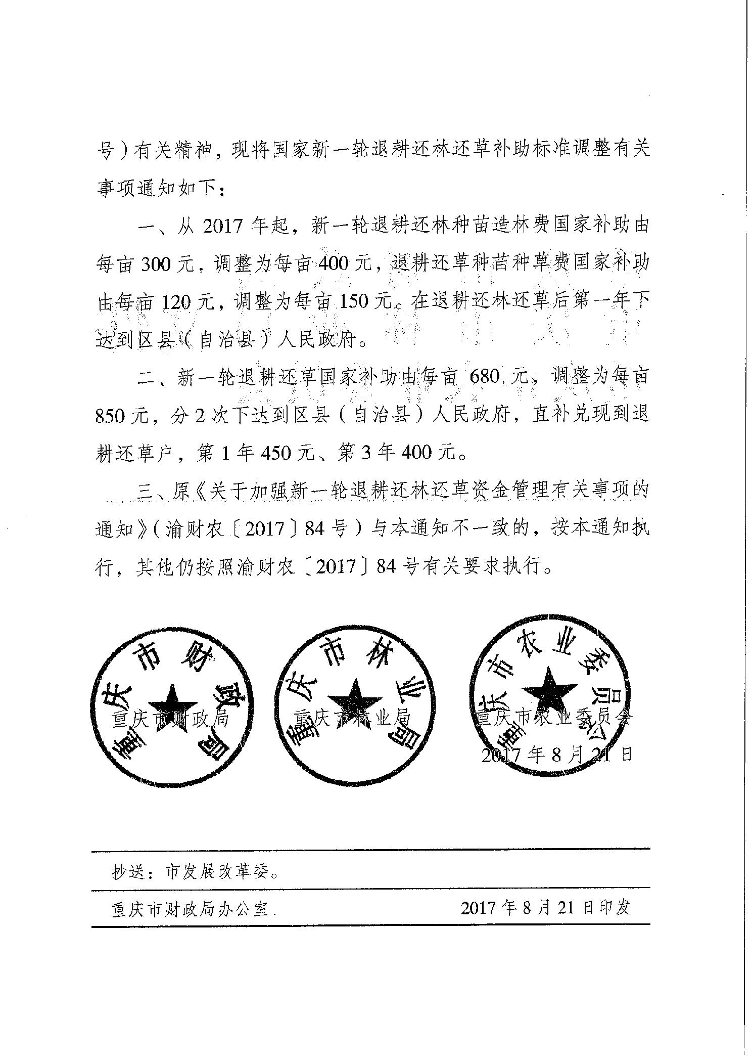 重慶市財政局 重慶市林業局 重慶市農業委員會 關于調整新一輪退耕還林還草補助標準有關事項的通知