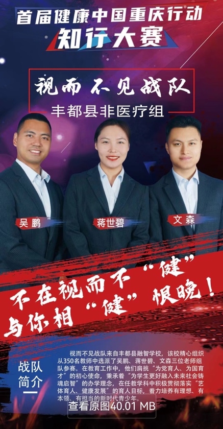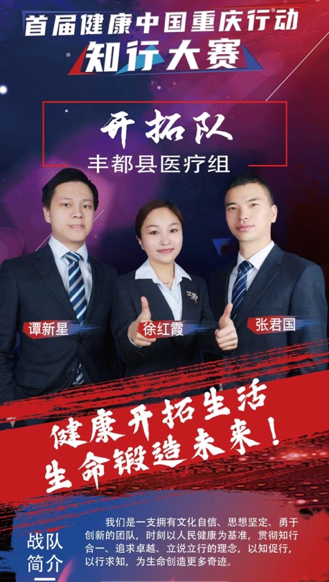 11月2日至4日,由健康中國(guó)重慶行動(dòng)推進(jìn)委員會(huì)辦公室、中共重慶市委宣傳部、重慶市教育委員會(huì)、重慶市人力資源和社會(huì)保障局、重慶市衛(wèi)生健康委員會(huì)、重慶市體育局、重慶市總工會(huì)、共青團(tuán)重慶市委員會(huì)、重慶市婦女聯(lián)合會(huì)、重慶市科學(xué)技術(shù)協(xié)會(huì)聯(lián)合舉辦的首屆健康中國(guó)重慶行動(dòng)知行大賽在重慶澳維酒店、重慶廣電大廈分別舉行了半決賽和決賽。健康中國(guó)重慶行動(dòng)豐都縣推進(jìn)委員會(huì)辦公室選派的“視而不見(jiàn)”戰(zhàn)隊(duì)和“開(kāi)拓”隊(duì),分別代表我縣非醫(yī)療組和醫(yī)療組參與獎(jiǎng)項(xiàng)角逐。
